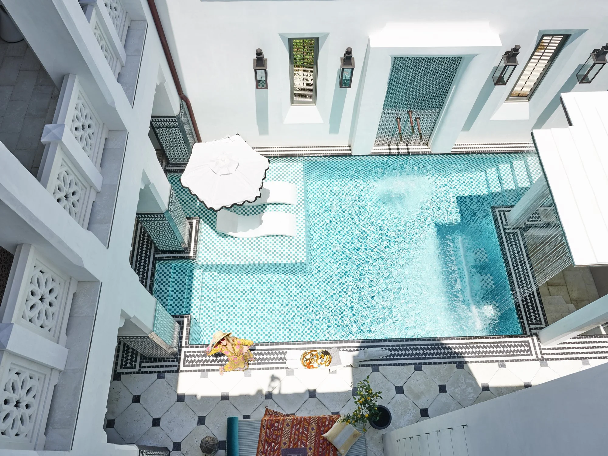 Built in the style of a traditional Moroccan riad, this beachfront retreat begins with a private courtyard and pool, where a gentle waterfall sets a tranquil tone. An intimate passageway leads inside, where white plaster covers nearly every surface, creating a cool, sun-washed calm. Many furnishings and accessories were sourced directly from Morocco, lending an authentic sense of place.