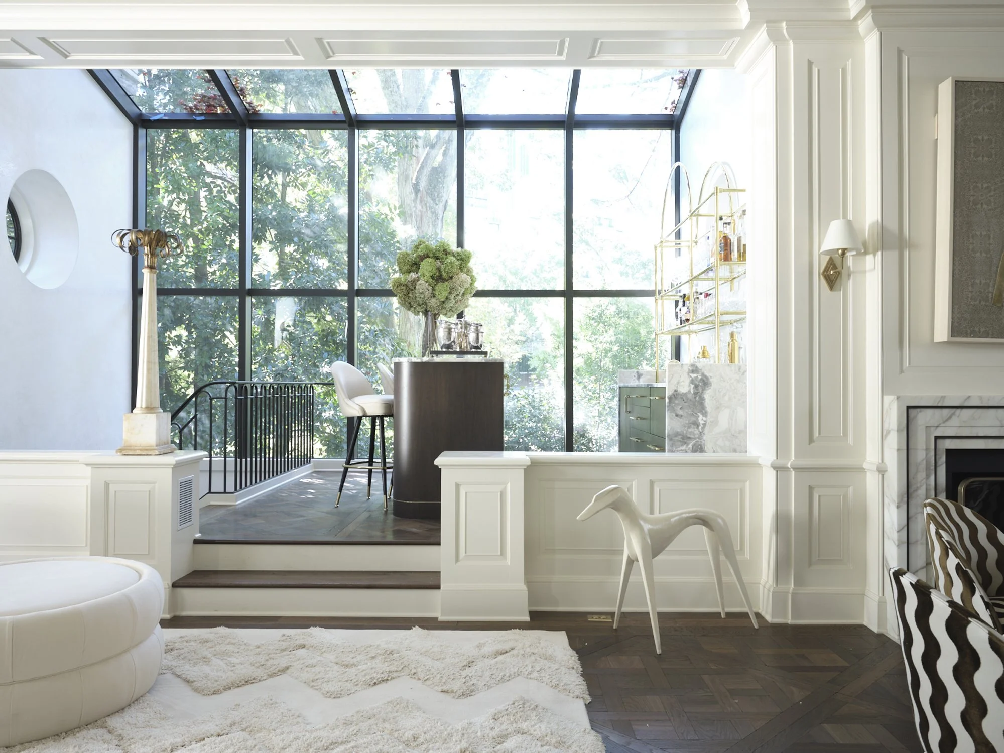 French Art Deco influences infuse this 1920s renovation in a historic neighborhood between park and city. Bold patterns in fabrics and rugs create a lively rhythm, while statement ceilings—tiled barrels, stepped coffers, wood panels, antique mirrors, and a fabric-canopied dome—add architectural drama.