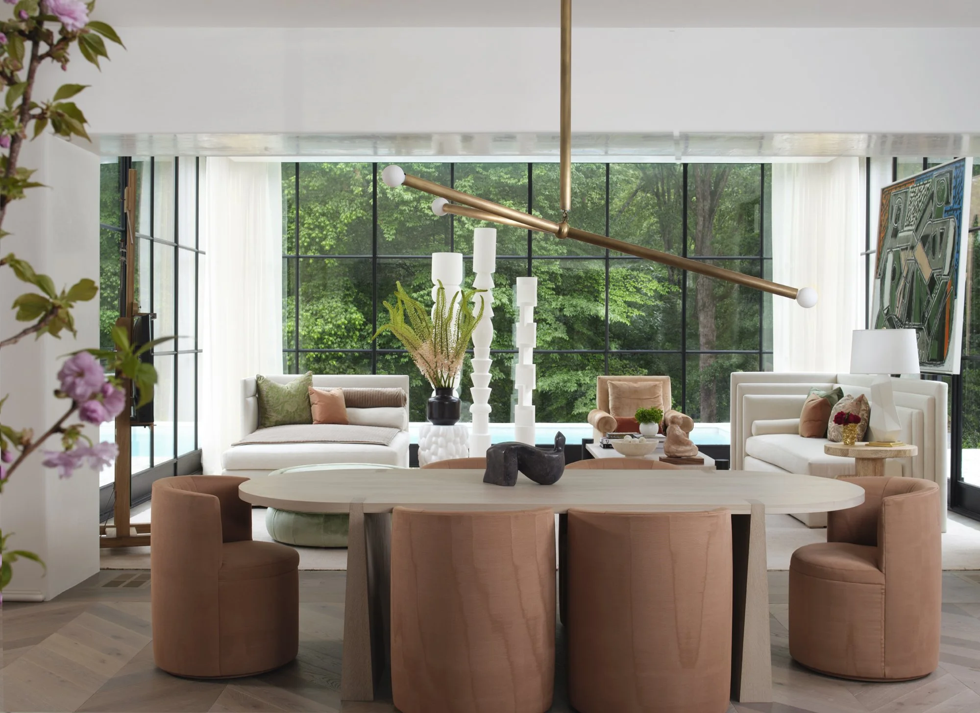 For this Mediterranean Italian–style showhouse, the vision was to channel a fresh, California ease—layering terracotta and faded green with airy neutrals for a look that feels both edited and effortless. With no walls in the main living space, two distinct seating areas were created: one for relaxed television lounging, the other for showcasing art. Casual Belgian linen softens large-scale custom furnishings, while cove lighting embedded in the soffit keeps the ceiling clean and architectural.