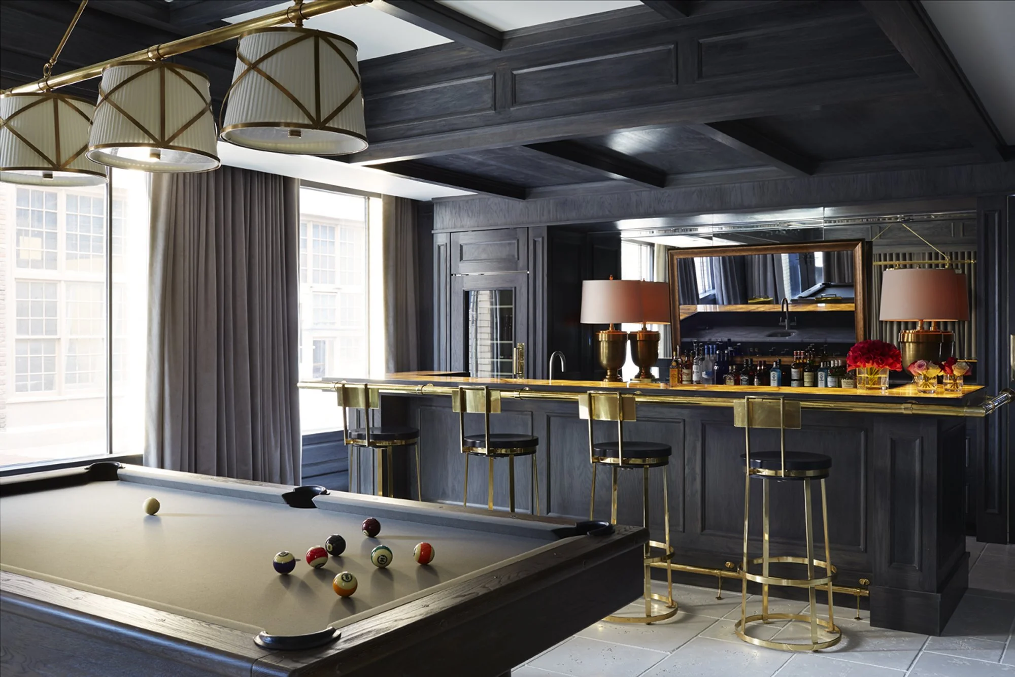 In the atrium, an extended dining banquette sits beneath pendant lights of varying heights, sparkling like jewelry above the table. The result is a home where modern architecture is enriched by timeless, welcoming charm.