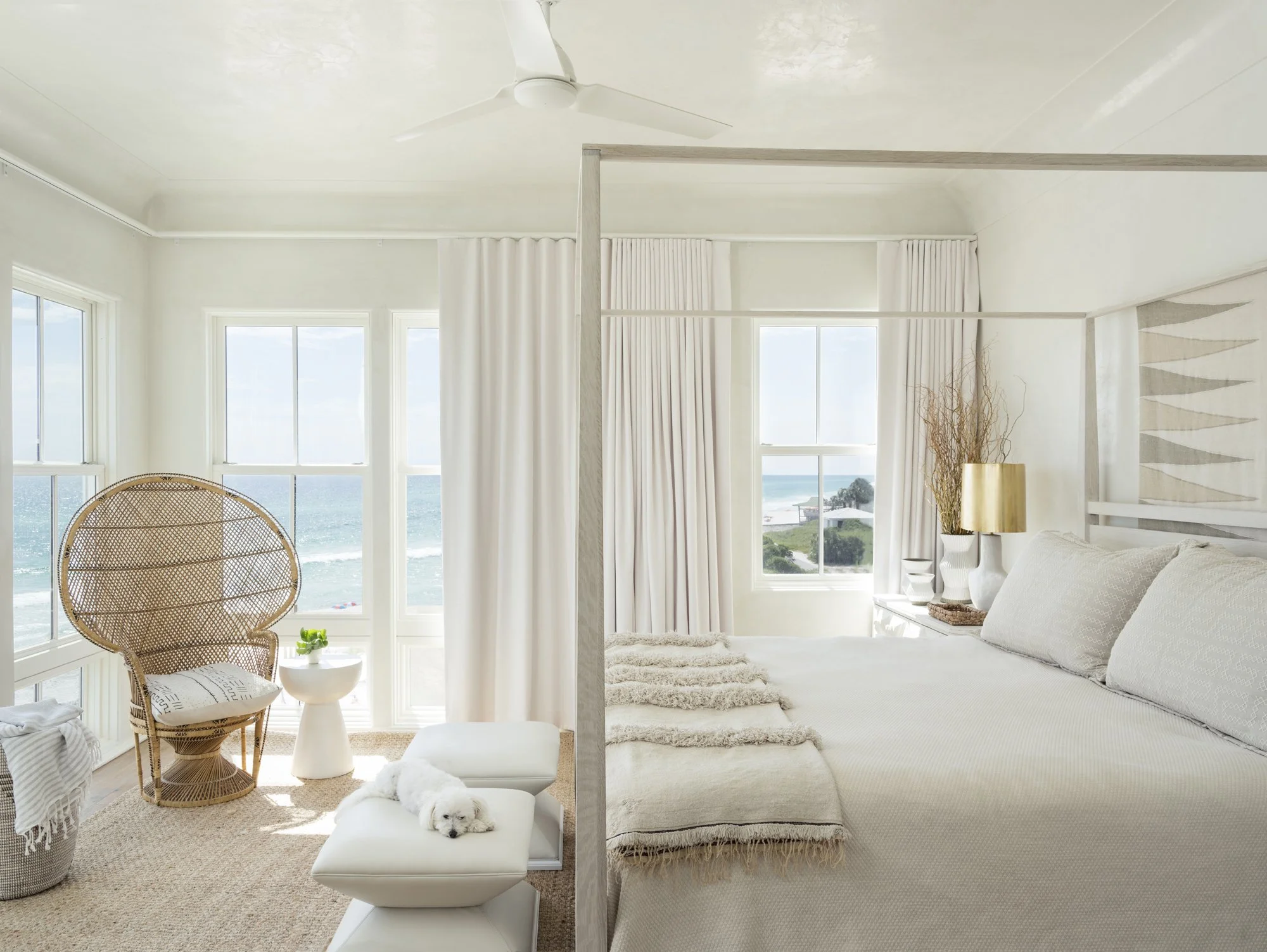 Designed as a Bohemian-inspired beach retreat, this four-story home embraces texture, contrast, and cultural influence to create a layered sensory journey for a multi-generational family. Raw wood floors, woven seagrass, reeded ceiling details, and a pebble-textured entry wall establish an organic foundation, while a bold neutral palette keeps the interiors both simplified and striking.