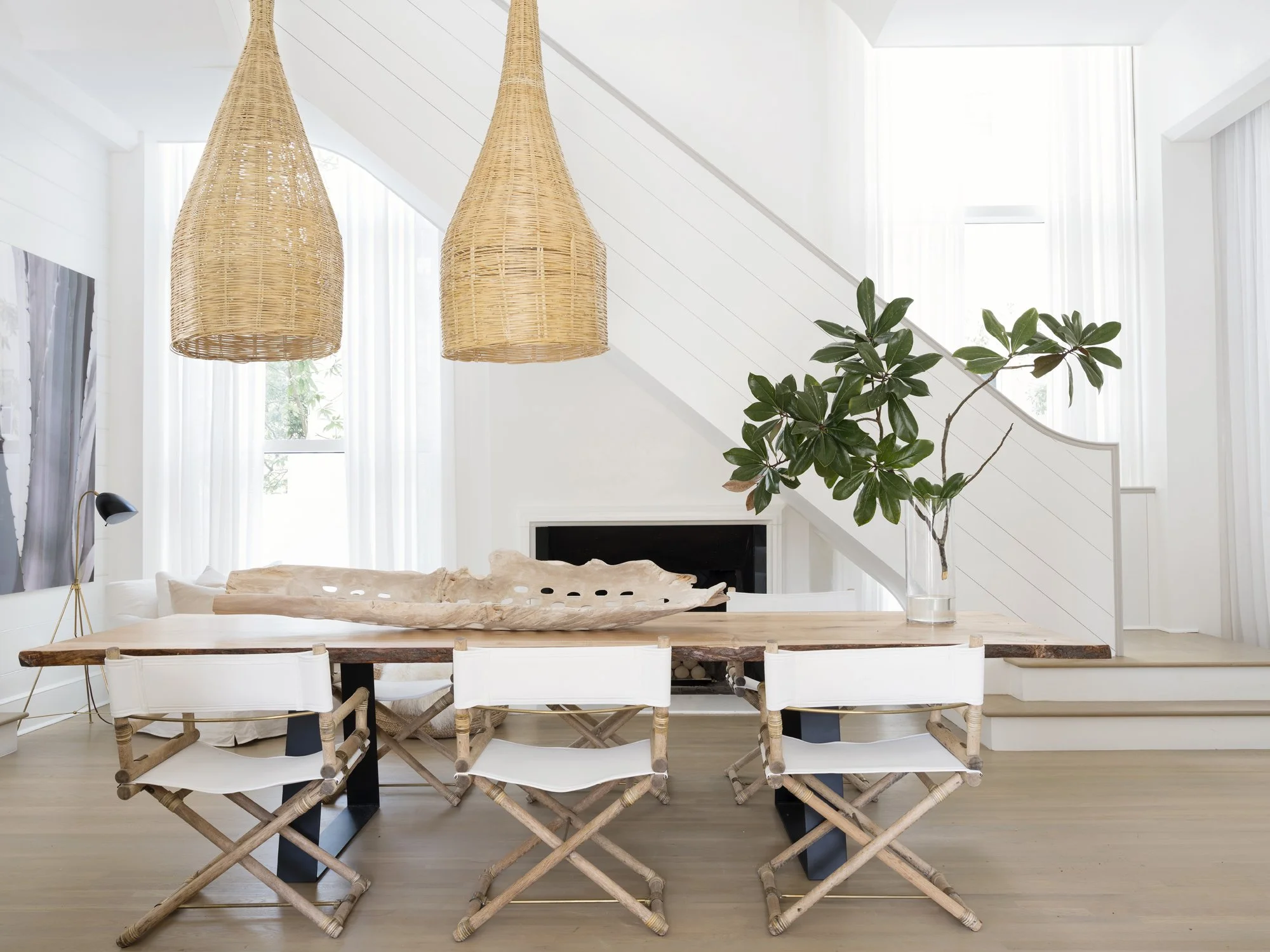 Inside, original elements were refreshed with painted kitchen cabinets, new countertops, and brightened beams. Reorienting the living and dining rooms created a more inviting flow, anchored by a live-edge table beneath asymmetrical Moroccan pendants. Billowing sheers add a dreamy mood in bedrooms and even the three-story stairwell, while practical updates—like reupholstering the banquette in white vinyl—blend beauty and function in this serene coastal escape.