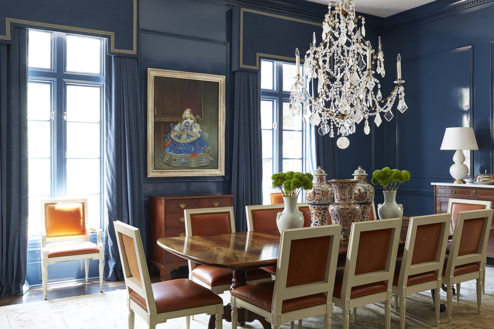 Classic details, from black-and-white marble floors to lacquered blue dining room walls, mingle with playful surprises like an animal-print stair runner and bold powder room wallpaper. The result is a home that is traditional yet brimming with personality, warmth, and modern ease.